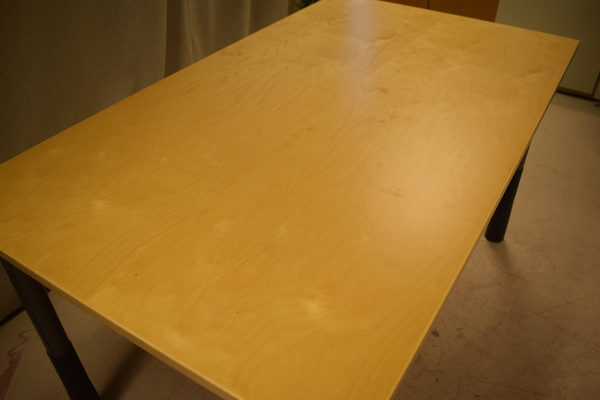 Bord med träskiva och metallben. Går ändra höjd manuellt på benen. D:80, B:140, H:73.