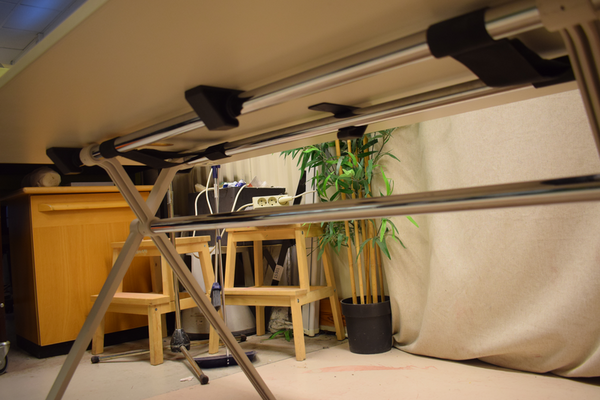 Bord med laminatskiva. Benen är en egen ställning som går ta av och sätta på. D:80, B:160, H:72.