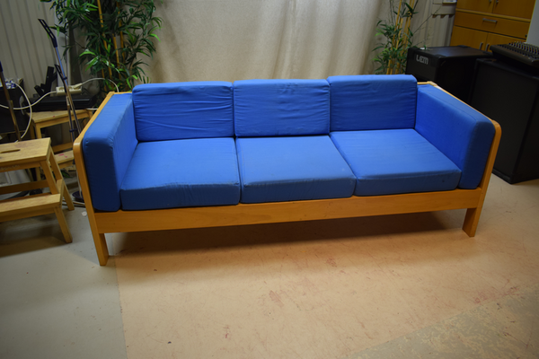 3-sits träsoffa med blåa tygkuddar. H:64 B:196 D:78