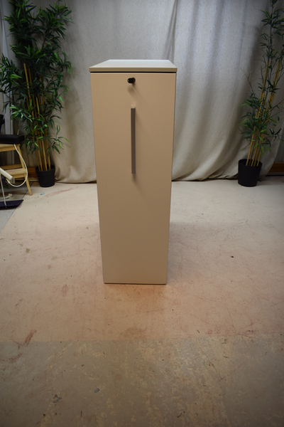 Arkivskåp i trä, 3 hyllplan som man kan dra ut åt vänster sida vit dörr övrigt i ljusgrå färg. D:80, H:40 H:125