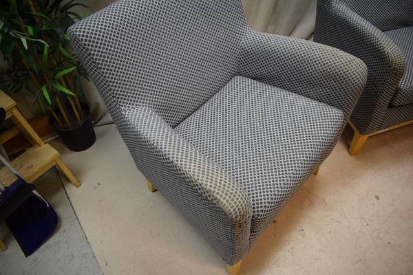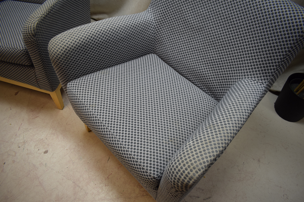Fåtölj i gråprickig mönster. Sitthöjd:45 H:83 B:76 D:72