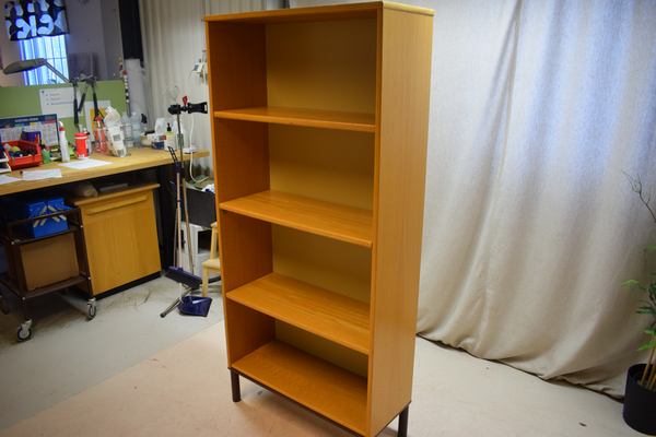 Ljusbrun bokhylla, med 4 hyllor och metallfot. D:32, B:80, H:172.