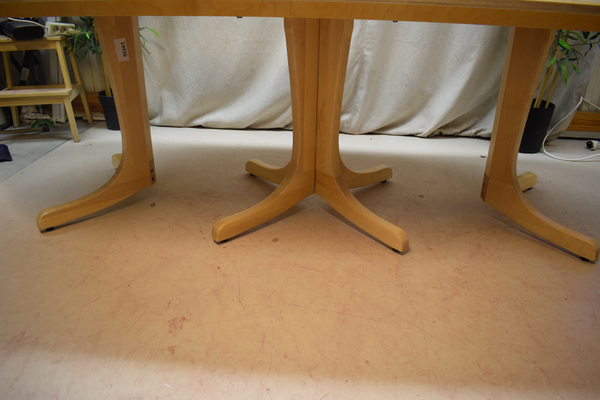 Nyslipat stort ljust träbord. Bastant fot i mitten och fötter vid sidorna. D:97, B:238, H:74.