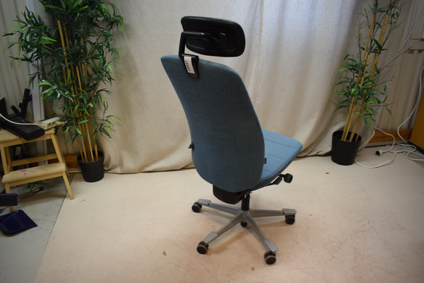 Kontorsstol i blått tyg med svart nackstöd. Höj- och sänkbart samt flera inställningar. Märke: Kinnarps. D:80, B:49, H(sits):43/58.