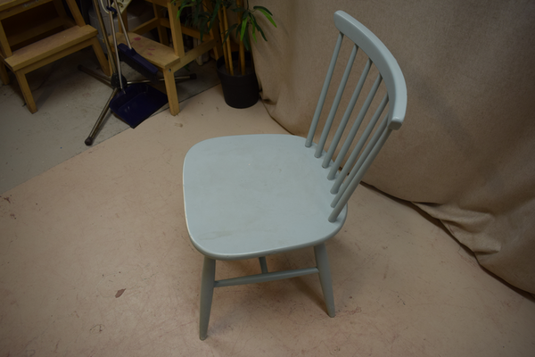 Ljusblå trästol med ribbad ryggdel. Är i använt skick med repor och märken. D:49, B:41, H(sitt):42, H:76.