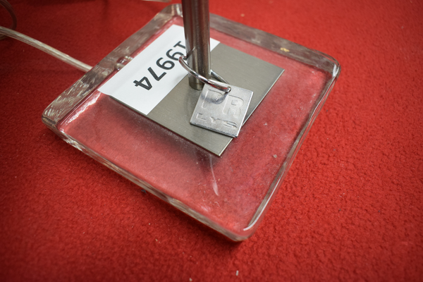 Bordslampa/fönsterlampa med glasfot och tygskärm av designmärket: PR lys. Av och på knapp finns på sladd. D:15, B:15, H:58.