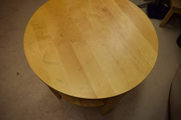 Sidobord i trä med underhylla. Är i använt skick med repor och märken. Ø:50, H:61.