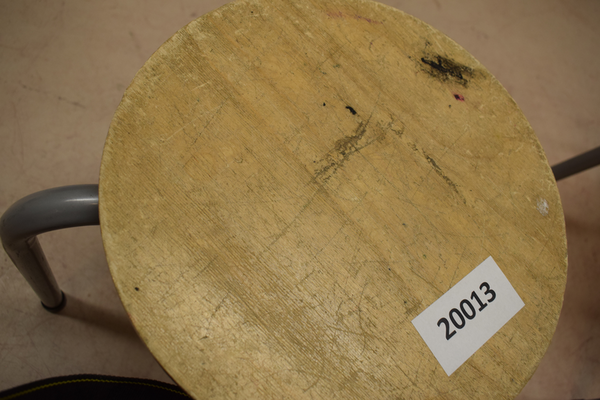 Sittpall i trä med metallben. Repig på sitsarna. H:38 B:35 D:35