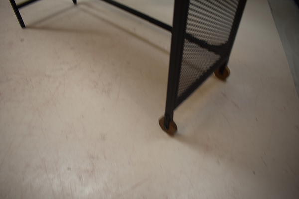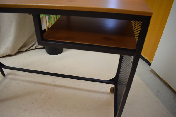 Litet datorbord i metall och brun träskiva. Har 2 hjul(hjul på ena sidan). D:37, B:100, H:75.