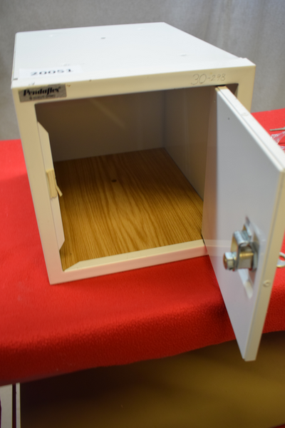 Dokument/värdeskåp. Märke: Pendaflex, modell 30-298. Är i ståplåt, vit färg. Är låsbart med nyckel. D:35, B:27, H:27.