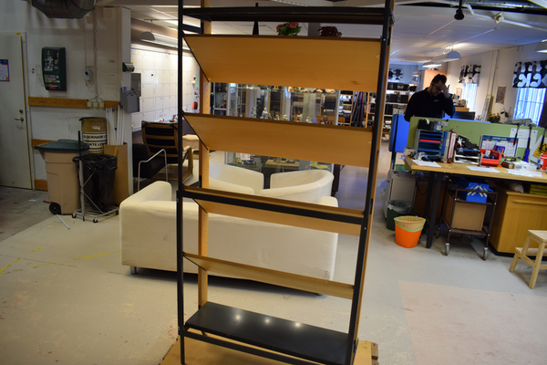 Tidningshylla i trä och metall.4 tidningshyllor och 2 hyllplan. H:195 B:92 D:34