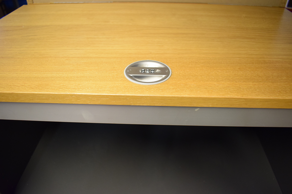 Jalusiskåp med kod lås som (är olöst) 3 - siffrig kod. tre hyllplan i skåpet, samt sladd hål nertill. Liten skada på övre kant. D x 45 B x 80 H x 120