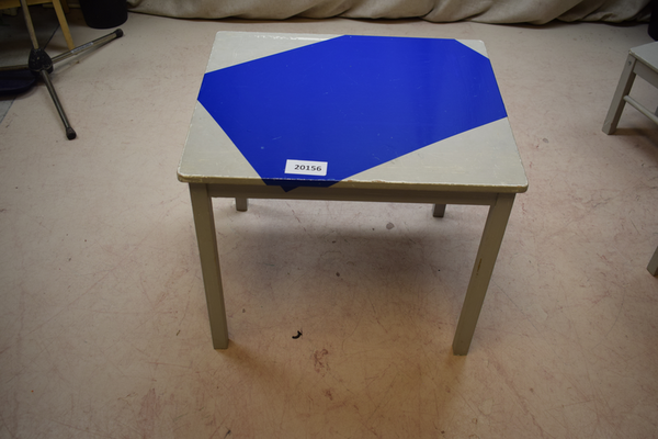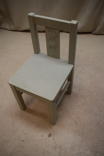 Bord och 4 stolar i gråmålad trä. Bord: H:51 B:59 D:50 Stol: Sitthöjd:29 H:54 B:27 D:29