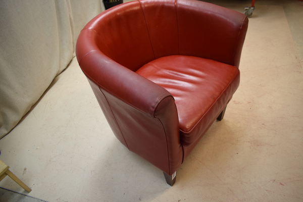 Röd skinnfåtölj med träben. Skinnet är lite slitet på armstöden. D:72, B:81, H(sits):46, H:77.