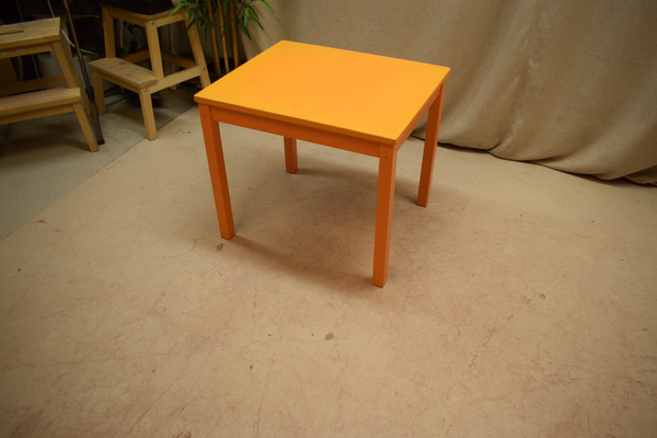 Sidobord/soffbord i brandgul färg. Är i trä. Finns repor och märken på. D:50, B:59, H:51.